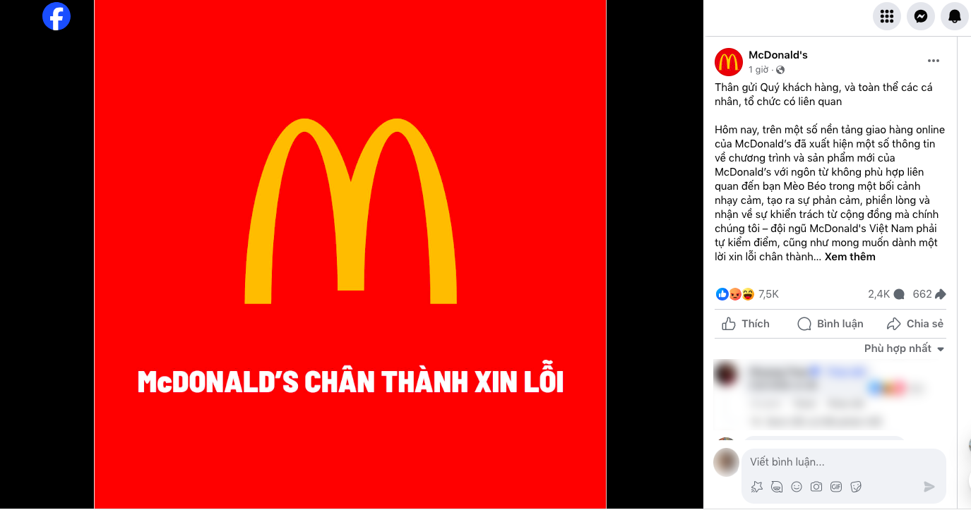 Ví dụ: Nội dung quảng cáo gây tranh cãi của McDonald’s là “Không thích ăn rau thì ăn gà dính phô mai BBQ”- 9/2024. Cộng đồng mạng đã nhanh chóng phẫn nộ. Thương hiệu đã nhanh chóng gỡ bài và đưa ra lời xin lỗi công khai trên trang Facebook chính thức ngay trong đêm xảy ra sự việc